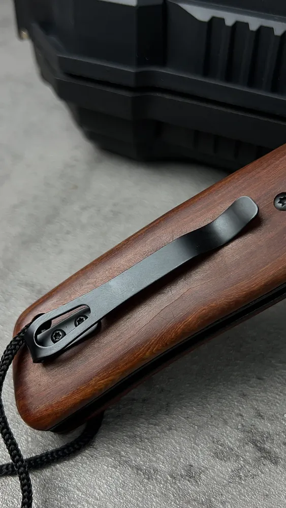 Заточка клинка має велике Лихо, яким зручно ривати землю, підриває каміння. Проста непрозора і неперервна Надечна конструкція. Покриття клинка і накладок – нітрид титана. Накладки були зроблені з дерева і сталі. Зручний “язичок” на замку підвищує комфорт при складанні ножа. Гарний ніж для авто.