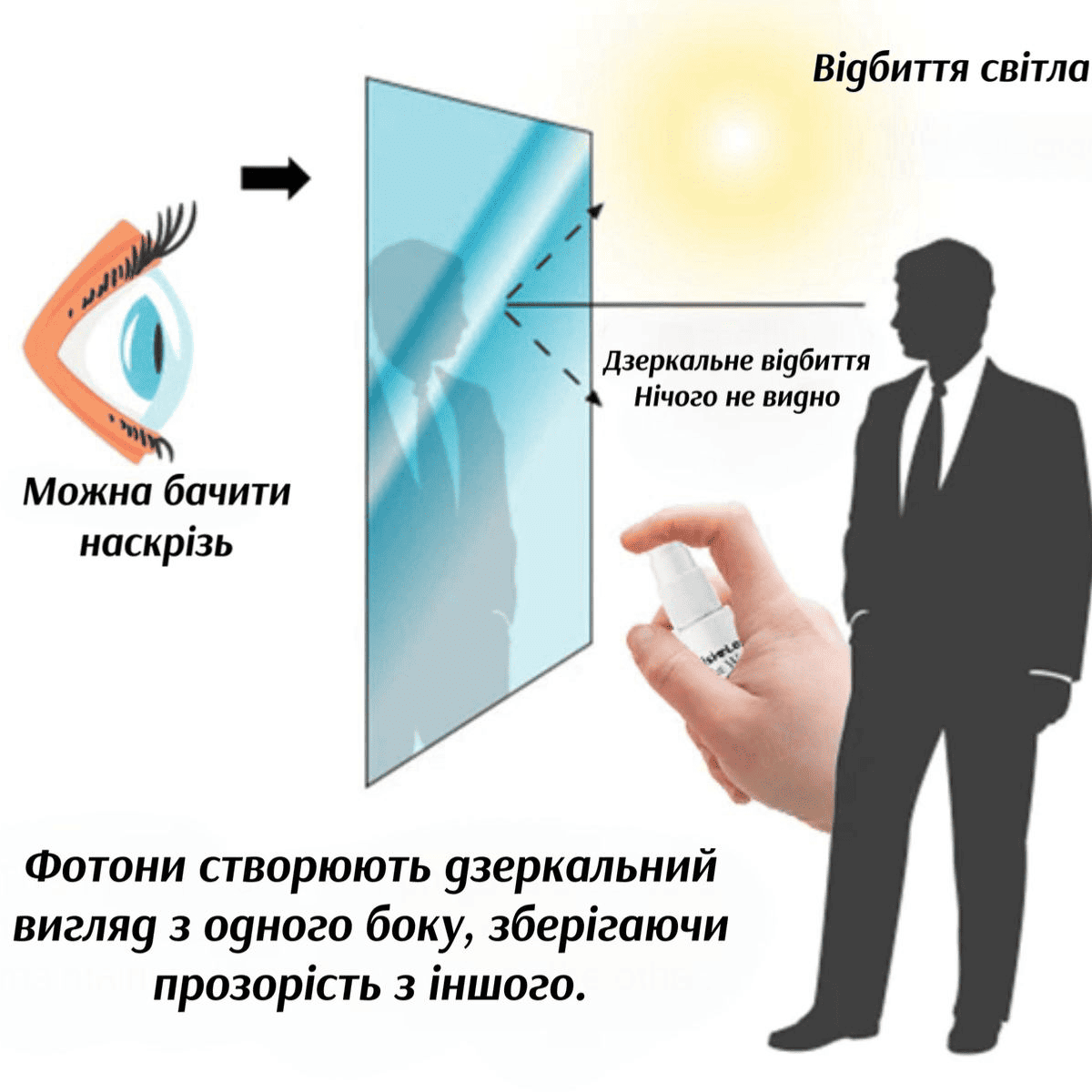 Mirror Spray – революційне рішення для легкого перетворення звичайного скла на одностороннє дзеркало. Наша передова формула дає вам змогу створювати приватні простори, зберігаючи чітку видимість зсередини!