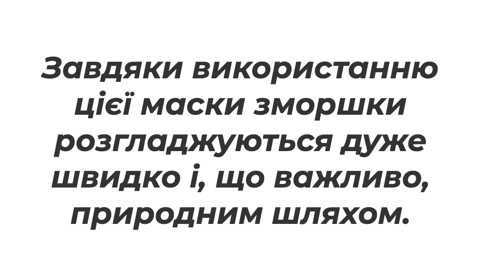 Anti Wrinklу Mask – відмінно зволожує ніжну шкіру, знімає набряки, а також розгладжує мімічні зморшки, роблячи погляд свіжим та відкритим. Можна також використовувати на міжбрівній частині та в носогубній зоні