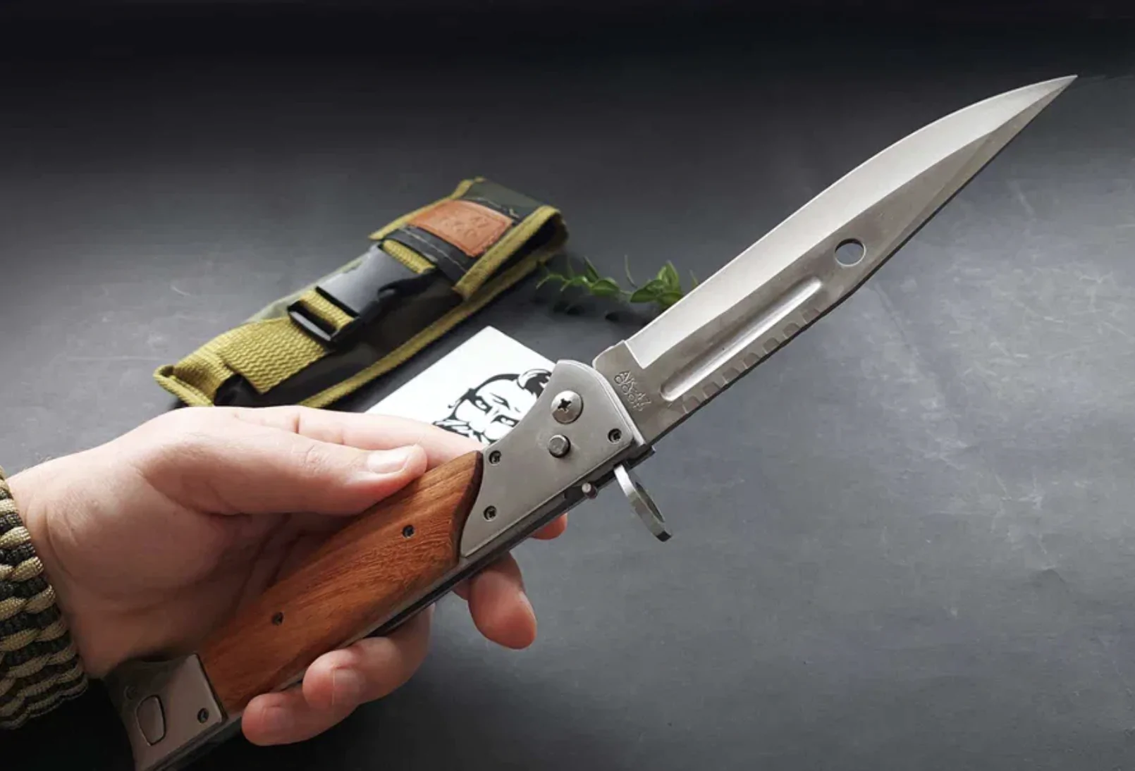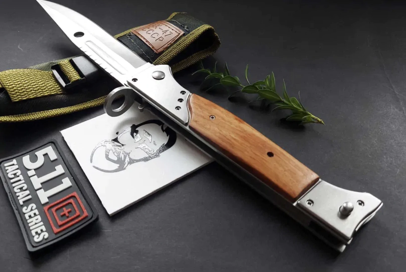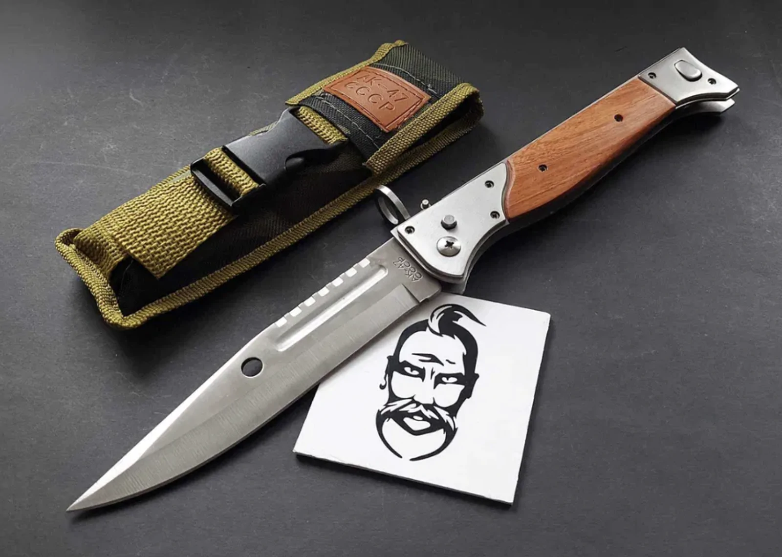 Викидний ніж АК-47 своєю формою повторює штик ніж знаменитого автомата Калашнікова. Модифікація – 27 см.Сама найбільша з існуючих. На клинку тавро СРСР Викидний ніж АК-47 має систему бічного автоматичного відкриття леза за допомогою кнопки розміщеної в головній частині рукояті.